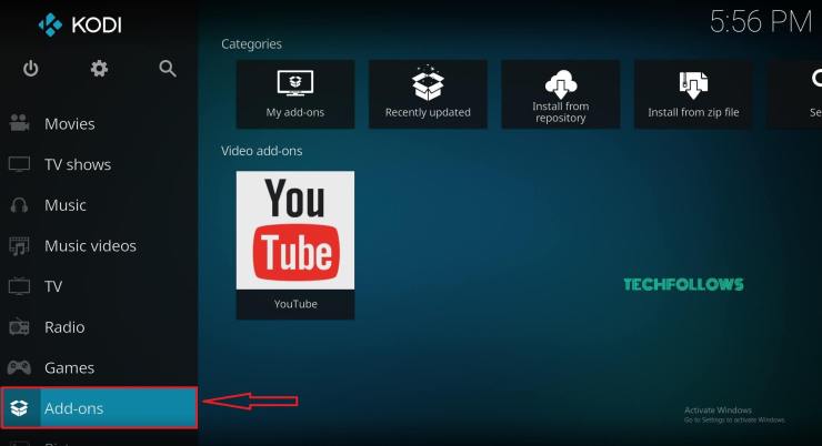 #1 : Lanza tu Kodi Media Player y toca la opción Addons en la página de inicio.