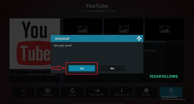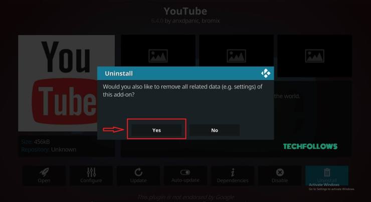 Seleccione Sí para desinstalar los complementos Kodi