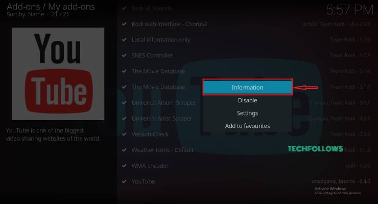 #5 : Después de hacer clic con el botón derecho del ratón en el addon, un cuadro emergente aparecerá en la pantalla. En ese cuadro, seleccione Información .