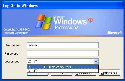 Una vez que el equipo se une al dominio de Active Directory, puede iniciar sesión en el dominio o en la cuenta de usuario local. En Windows XP y Windows Server 2003, en la pantalla de inicio de sesión hay una lista desplegable » Iniciar sesión en «. Aquí puedes elegir si quieres iniciar sesión bajo la cuenta del dominio o con el usuario local (selecciona » este ordenador «).
