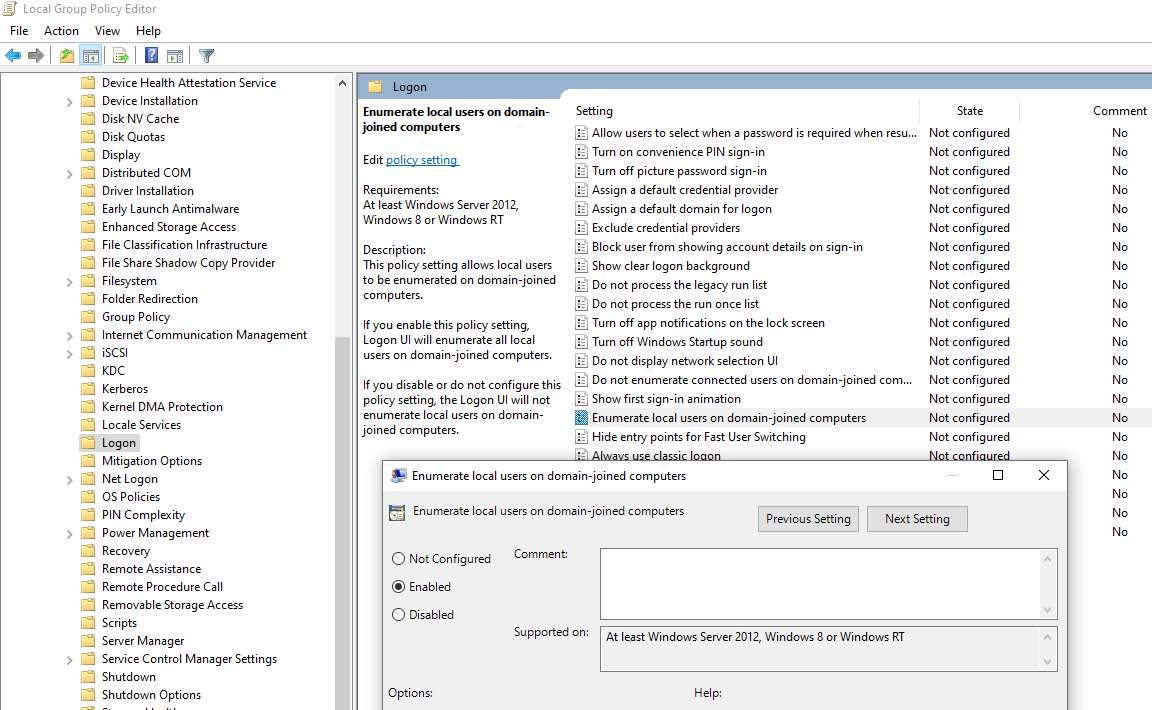 Habilitar la política » Enumerar a los usuarios locales en las computadoras de dominio unido «;
