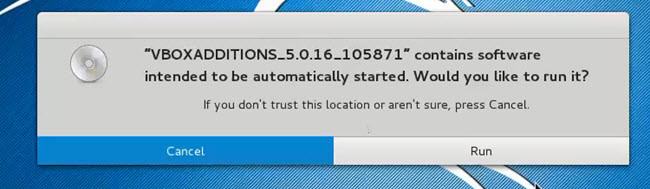 Una nueva y pequeña ventana aparecerá para usted que dice «El software se ejecutará directamente desde el medio VBOXADDITIONS_4.2.8. Nunca debes ejecutar un software en el que no confíes. Si tienes dudas, pulsa Cancelar». Verás este mensaje. ¿Qué vas a hacer? Si pulsas «Ejecutar», no pasará nada. Pulsa » Cancelar «.